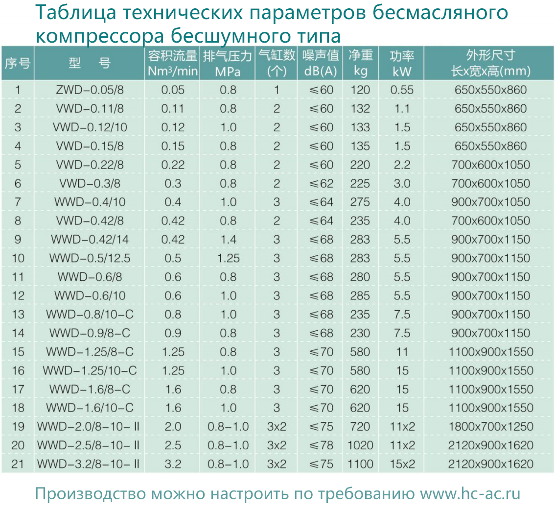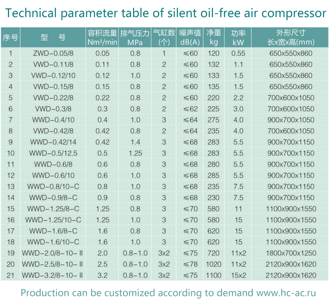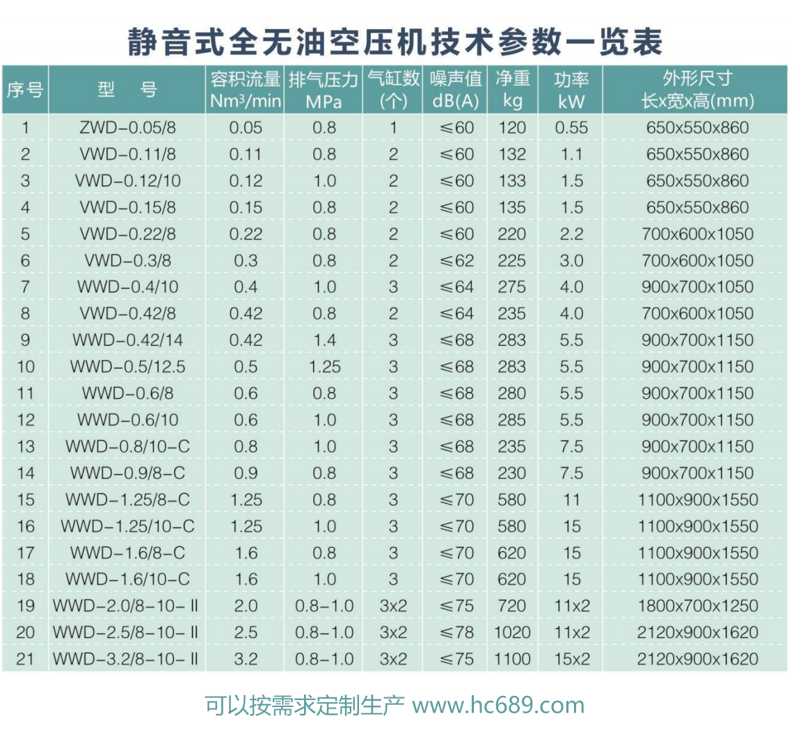 靜音式低壓無油空壓機選型參數表